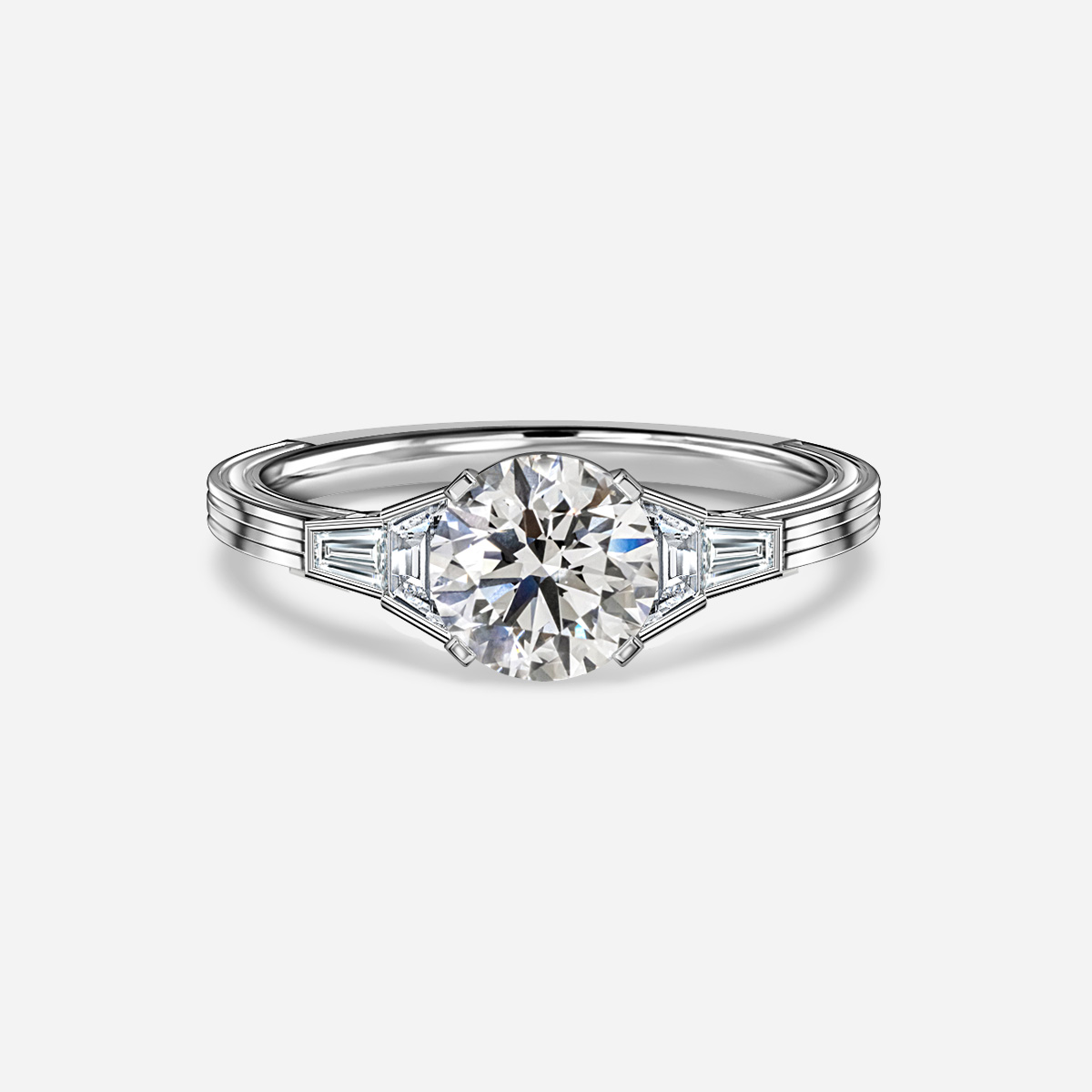 The Alissa White Gold Vintage Engagement Ring features a central diamond flanked by baguette diamonds on both sides in a classic trilogy setting, set in white gold for a timeless appeal. Handcrafted in Hatton Gardens, London. Centre Diamond Not Included Setting only