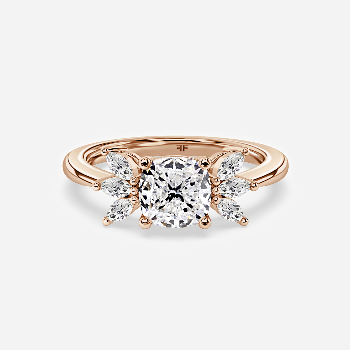 A rose gold engagement ring features a radiant center stone surrounded by a dazzling array of marquise cut accent diamonds, creating a symphony of light and sparkle. Handcrafted in Hatton Garden, London Centre Diamond Not Included Setting Only