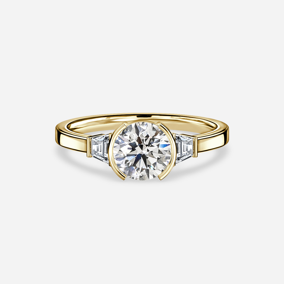 The Theia Yellow Gold Semi Bezel Set Trapezoid Trilogy Engagement Ring elegantly combines modern design with timeless sophistication, featuring a striking trapezoid-cut centerpiece flanked by two complementary stones, all securely embraced by a yellow gold semi-bezel setting. Handcrafted in Hatton Gardens, London. Centre Diamond Not Included Setting Only